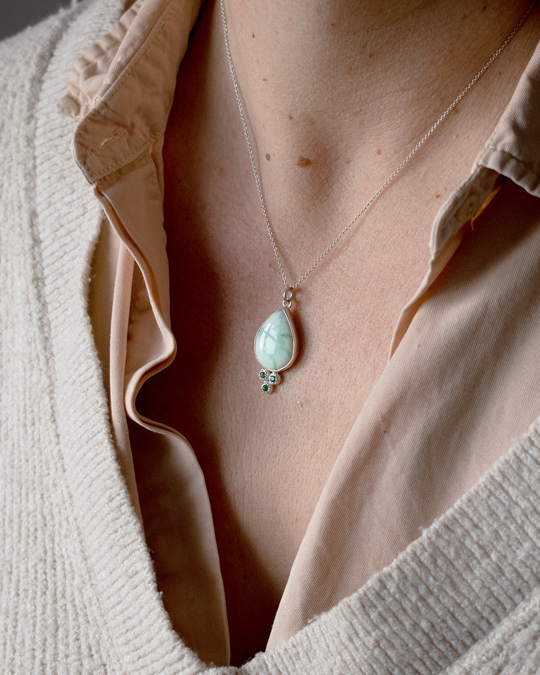 En Mod Málaga creemos en las joyas que cuentan historias y que nos acompañan en los momentos importantes. Este collar artesanal de turquesa y esmeralda montado en plata es una pieza creada para quienes buscan algo más que un accesorio: un símbolo, un amuleto, un recordatorio de lo que te hace única. Cada collar está hecho a mano en nuestro taller, respetando la forma natural de cada piedra para que mantenga su esencia. La turquesa, protectora y profundamente espiritual, aporta calma y equilibrio. La esmeralda, piedra de la renovación y de la verdad del corazón, invita a conectar con tu energía más pura. La combinación de ambas crea una joya con una presencia muy especial: fresca, luminosa y con un significado que se siente desde el primer momento. Perfecta para llevar a diario o para regalar a alguien que aprecias de verdad. Características del collar • Pieza artesanal hecha a mano en nuestro taller. • Piedras naturales seleccionadas una a una: turquesa y esmeralda. • Montado en plata de ley 925. • Cada collar es único: las formas naturales de las piedras hacen que no existan dos iguales. • Un amuleto para atraer calma, protección y claridad emocional. En Modmalga diseñamos joyas que te acompañan, te representan y te conectan con lo que sientes. Este collar de turquesa y esmeralda es una de esas piezas que lo dicen todo sin necesidad de palabras.