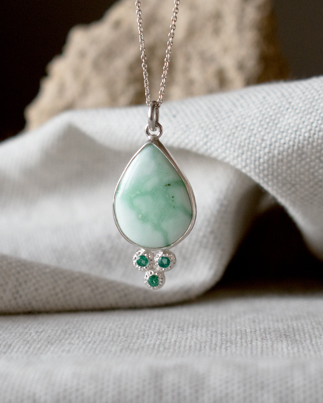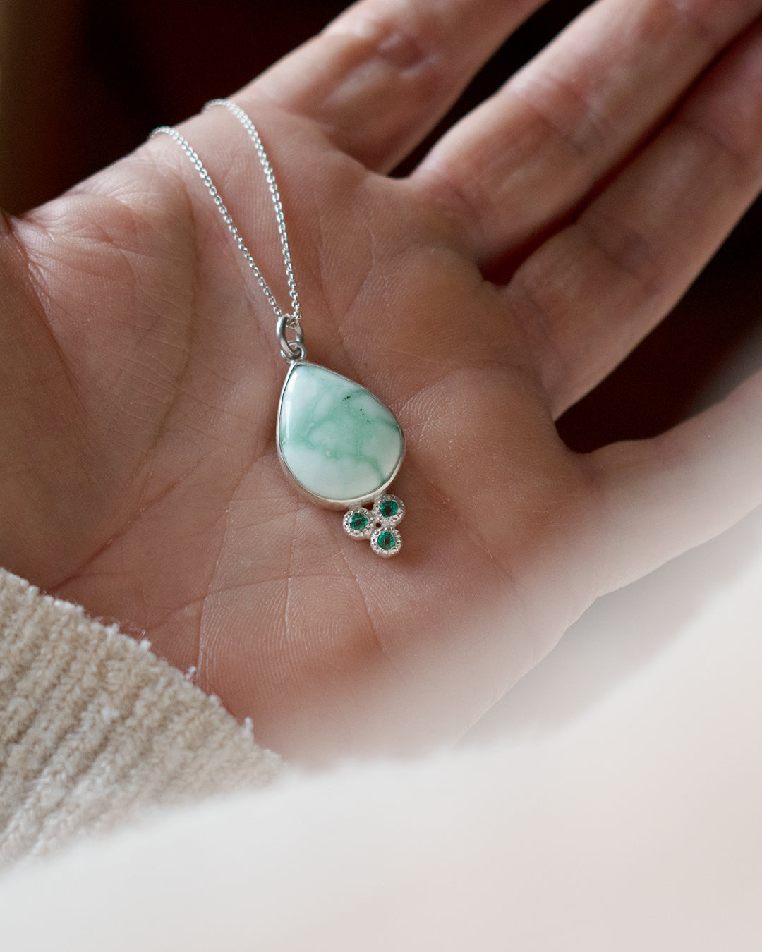 Collar de plata 925, con una turquesa de arizona natural de 20 x 15,5 mm, acompañada de 3 esmeraldas de 2mm.