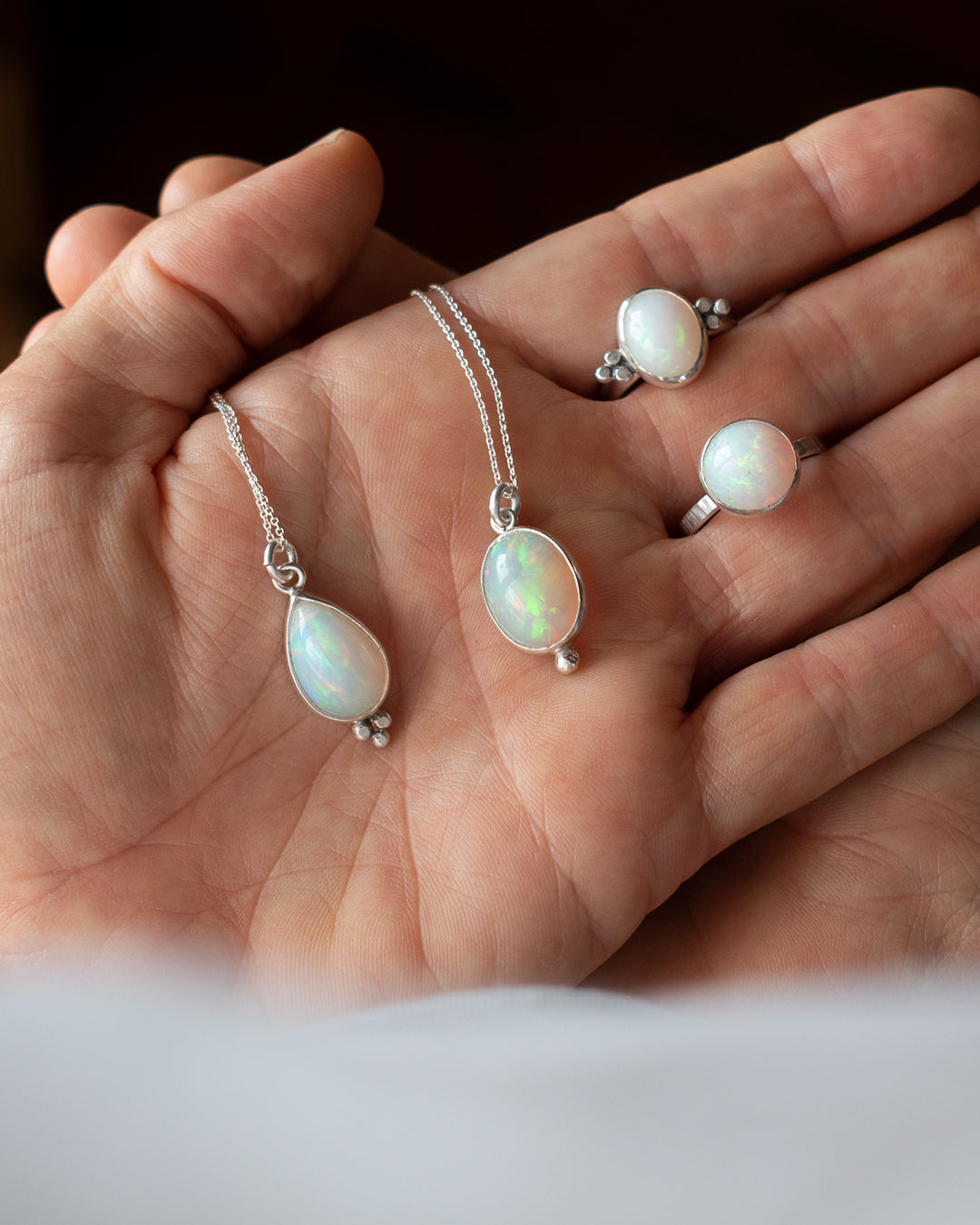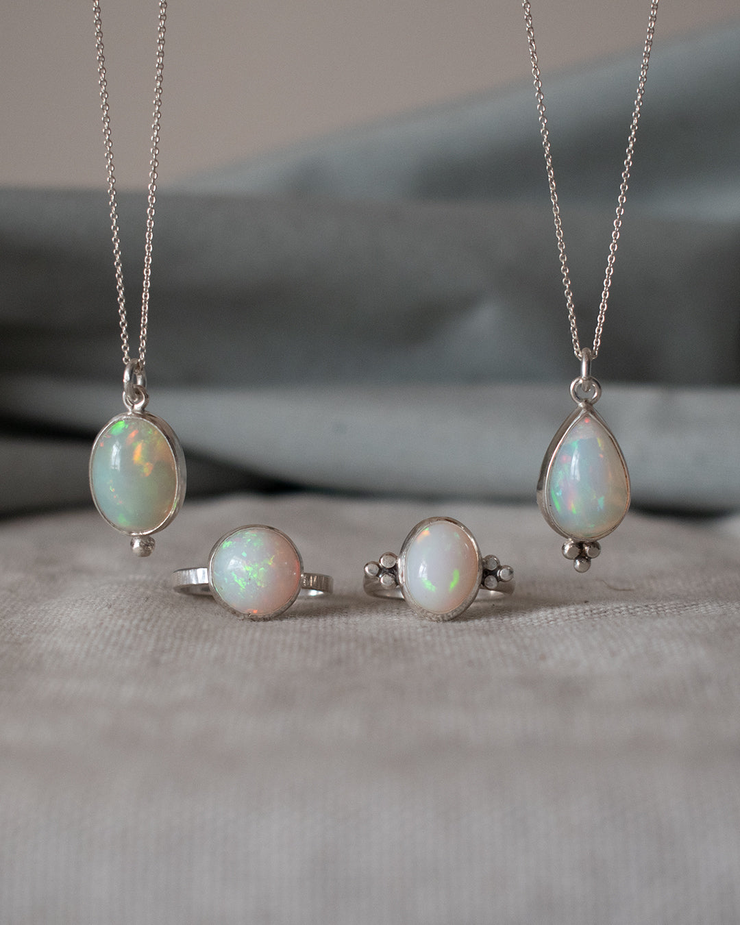 Os dejamos una selección de joyas en plata de ley y ópalo. Cada piedra única, anillos y collares hechos a mano en nuestro taller de la costa malagueña.